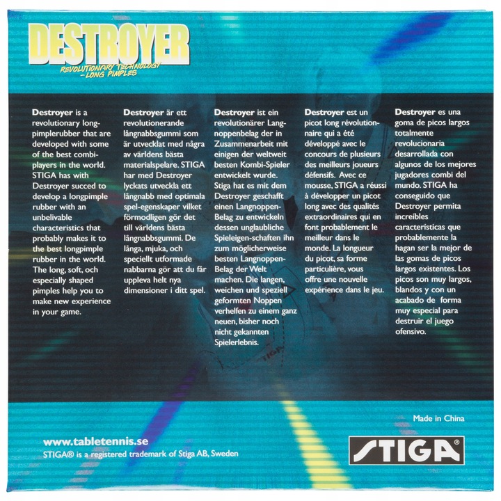 Destroyer to unikalna kompozycja tworzyw, stworzona dzięki pomocy najlepszych graczy. Charakteryzuje się niezwykłą miękkością pozwalającą na stosowanie indywidualnych technik. Długie czopy charakteryzujące się wysokim poziomem zakłóceń. Przeznaczone zarówno do klasycznej gry defensywnej jak i do bloku.