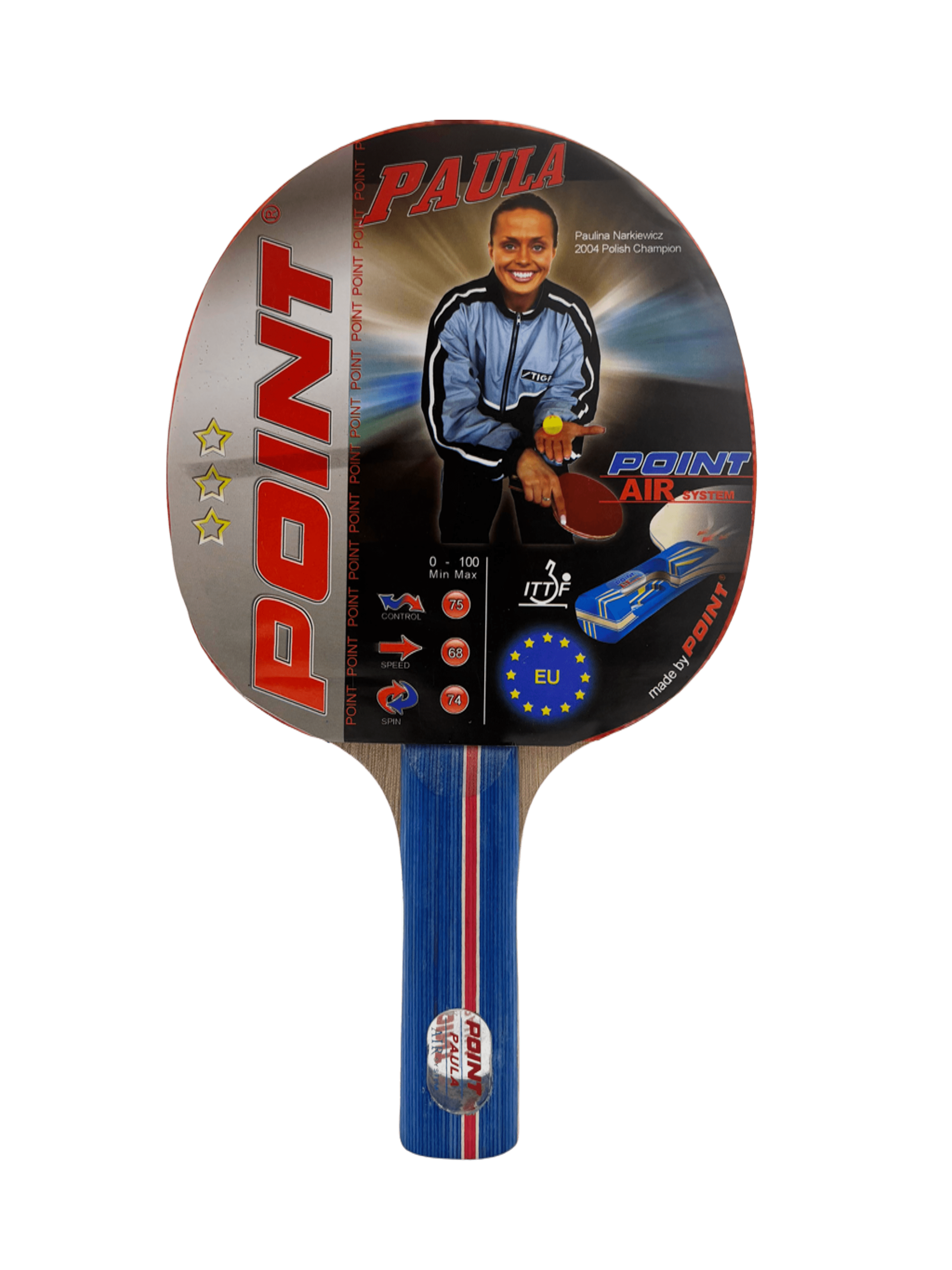 Rakietka do tenisa stołowego POINT PAULA to solidny wybór dla graczy szukających balansu między szybkością, rotacją i kontrolą – pięciowarstwowa deska z systemem AIR gwarantuje wygodę i dobre wyważenie, a okładziny o grubości 2 mm zapewniają mocny spin (74) przy zachowaniu kontroli (75) i dynamiki (68); dzięki temu rakietka świetnie sprawdza się zarówno w rekreacyjnej grze, jak i podczas treningów, oferując wysoką jakość w atrakcyjnej cenie.